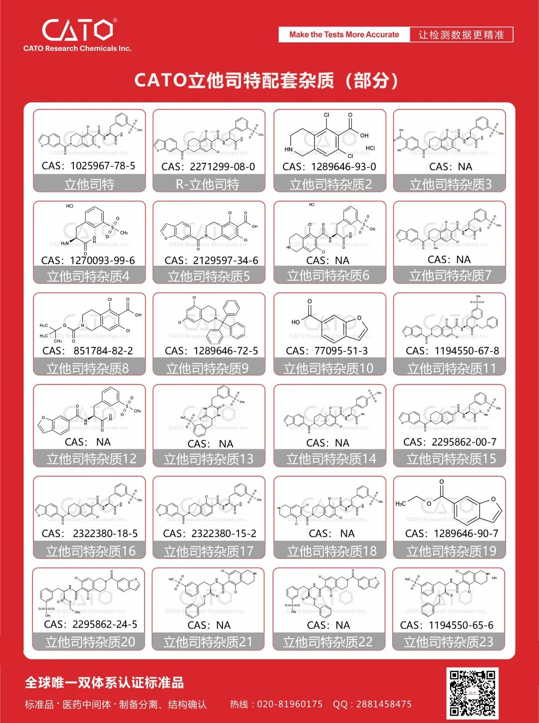目前,CATO在研立他司特全系杂质,已经完成了其中的一部分。相信在不久以后,CATO完成立他司特全系杂质后,一定会助力立他司特在治疗干眼病和其他疾病方面有着更好更安全的应用。