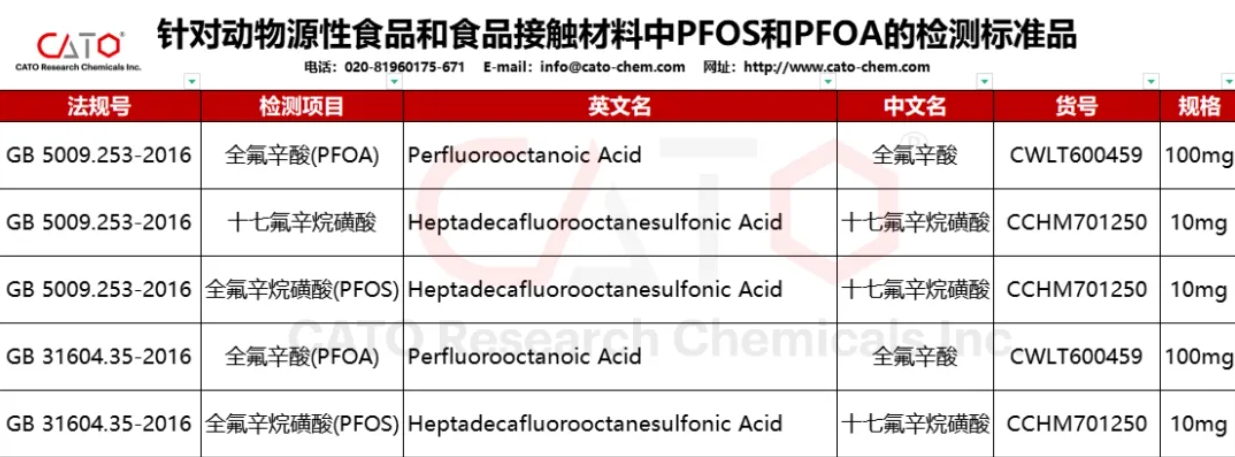 在中国,针对PFAS的监管主要集中在食品接触材料、化工产品等领域。 以下为食品接触材料的配套检测 PFAS 标准品: