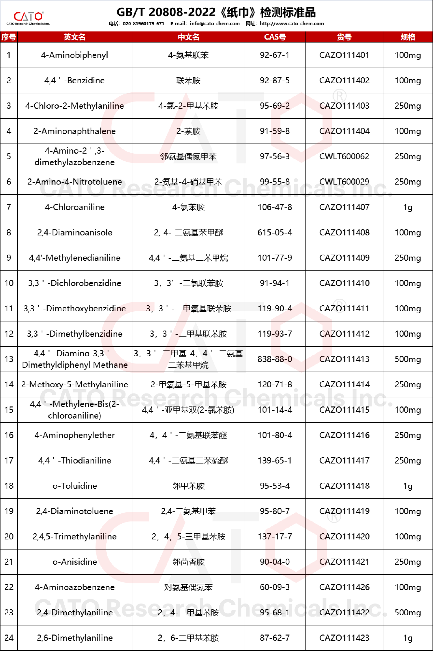 此外,国家标准化管理委员会还制定了多项纸巾相关的国家标准,如GB/T 20810-2018《卫生纸》和GB/T 20808-2022《纸巾》等,以规范纸巾生产。CATO提供配套检测标准品,助力监管部门、检测机构准确识别纸巾中的有害物质,确保市场上流通的纸巾产品符合安全标准,保障消费者的健康权益。