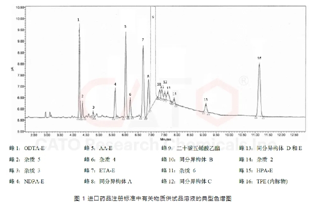 为解答这些疑问,CATO分析检测中心展开了对二十碳五烯酸乙酯这一系列杂质的调查和研究。我们仔细核实了各杂质的质谱、核磁等定性数据,并结合定制合成的工艺路线,确认产品结构本身无误。这就引出了更深层次的问题:为什么会与进口药品注册标准的出峰不符?标准中各杂质标示的结构是否有误?如果标准本身有问题,那么标准中对应RRT的杂质究竟是什么?