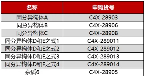 CATO研发团队对进口药品注册标准中的这些同分异构体杂质按照其标示的结构,进行了一一定制合成,对应申购货号结构分别如下:
