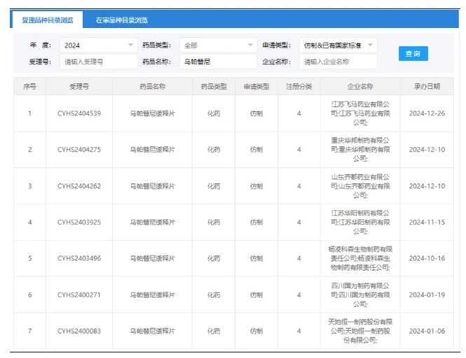 专利无效后,国内企业迅速行动,天地恒一制药和四川国为相继提交了乌帕替尼缓释片的上市申请。截至目前,已有7家仿制药企业按照4类仿制药途径提交了乌帕替尼缓释片的上市申请,均处于审评审批阶段。这标志着乌帕替尼在中国市场即将迎来仿制药企业的激烈竞争。